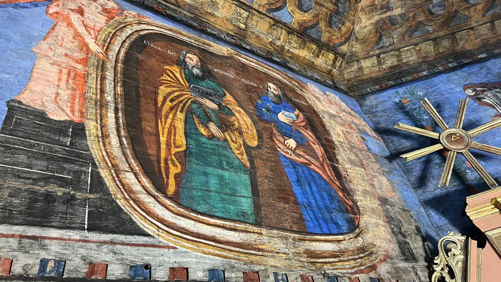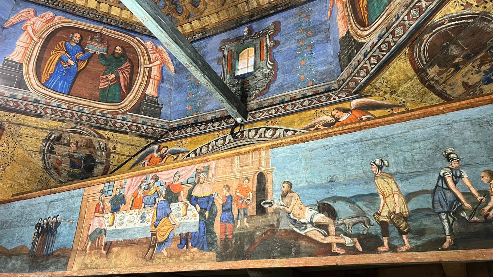 «На хорах ми бачимо сцену, де у правій частині персонажі за столом в одязі римлян, а поруч зображена та ж подія, де музиканти вже в одязі XIX ст., в штанах і фраку. Такого ви не знайдете в жодній іншій церкві, у цьому унікальність цих розписів», – розповідав раніше художник-реставратор Олег Рішняк.