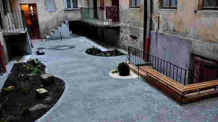 У дворі відновили торцеву стіну, зробили чітке планування, нове мощення та квітники, зокрема, клумбу на підвищенні уздовж брандмауера. Також тут облаштували дві лавочки та дерев’яну терасу. Минулого тижня у дворі висадили зелені насадження.