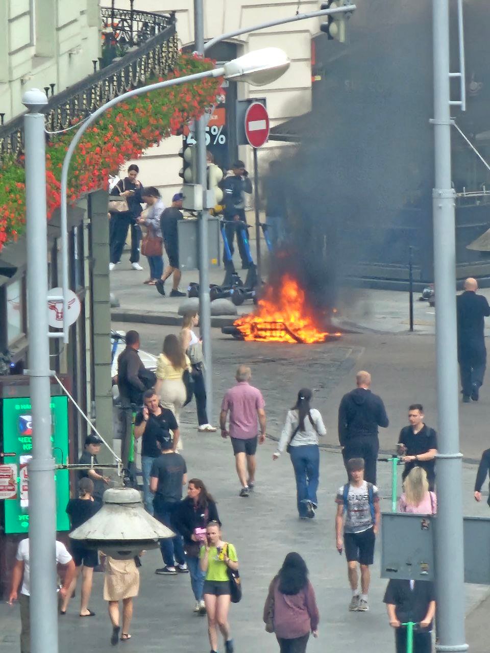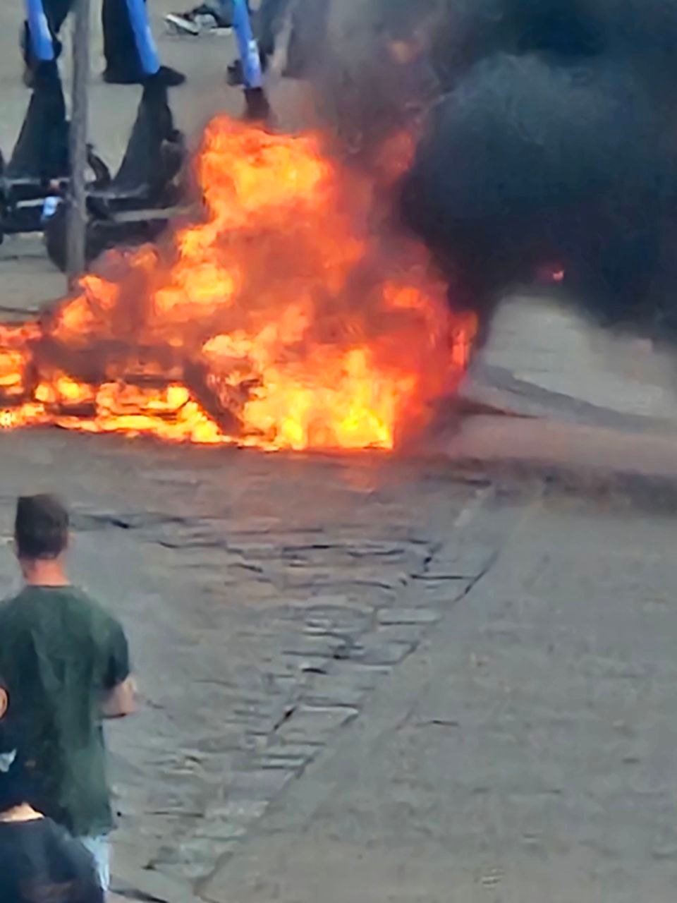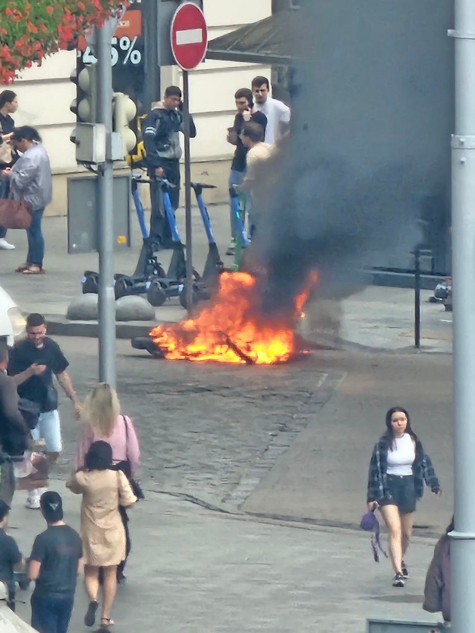 Момент загорання електроскутера потрапив на камери управління безпеки міста. Як видно на відео, скутер належав кур’єру доставки Glovo, про що свідчить жовтий рюкзак.