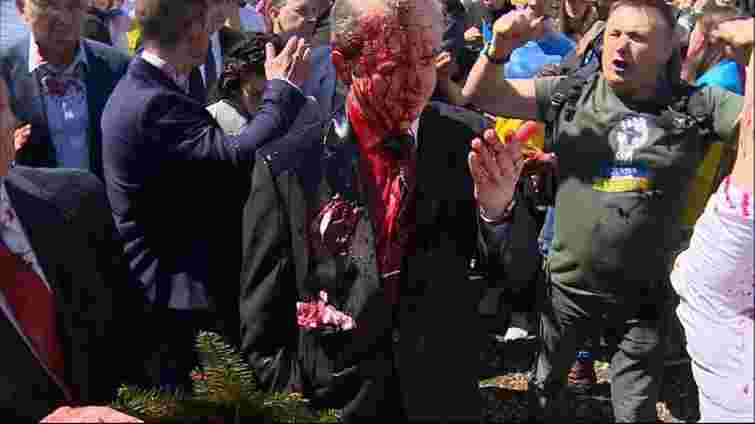 «Ми підійшлидо посла, розірвали пакети зі штучною кров’ю, і ця кров впала на посла та його помічника. Вони збентежені пішли, а ми кричали "фашисти". Ми не дозволили їм покласти квіти», – цитує Ірину Земляну польський сайт myPolitics.