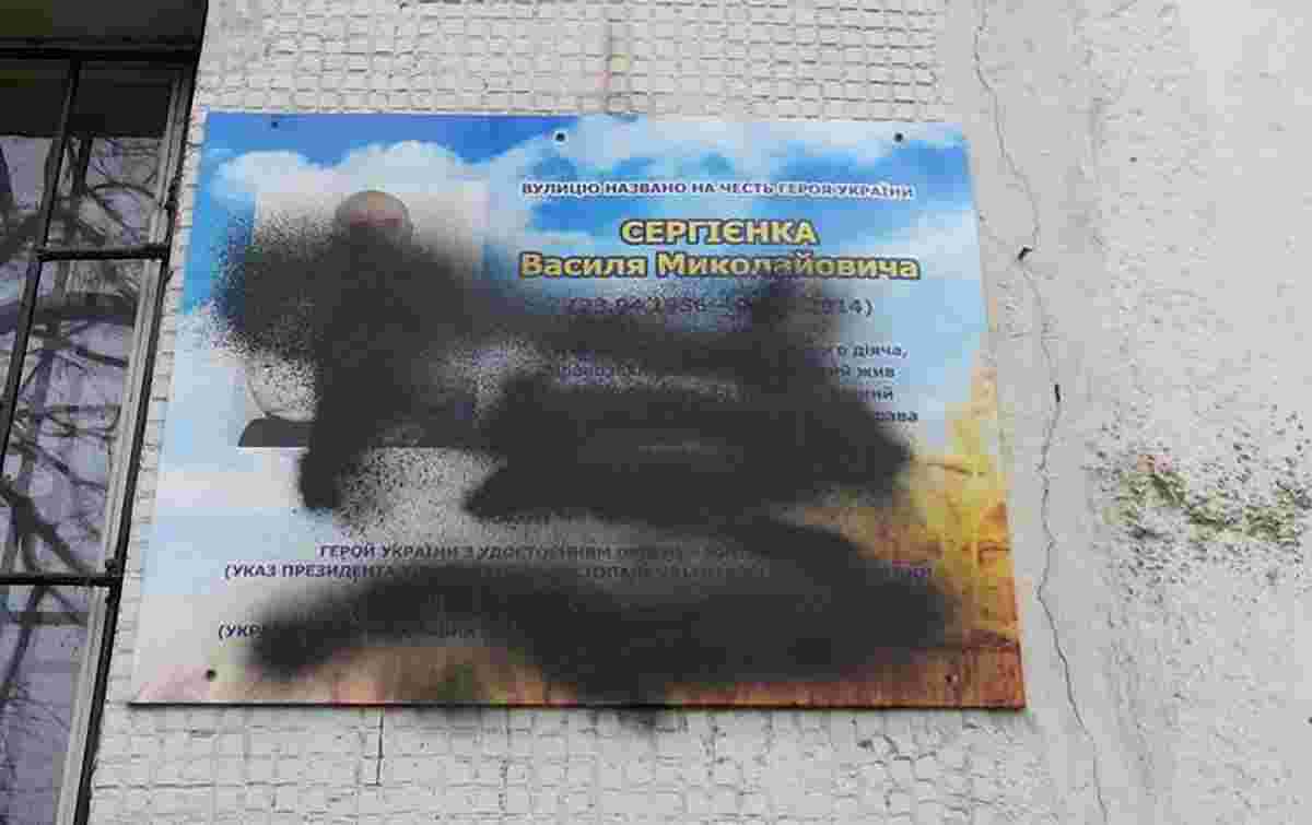 Невідомі зловмисники замалювали чорною фарбою меморіальну інформаційну дошку пам’яті Героя Небесної сотні Василя Сергієнка, встановлену на вулиці, названій його ім’ям. Про це повідомили користувачі соцмереж.