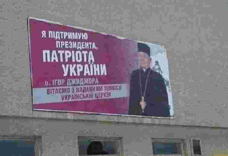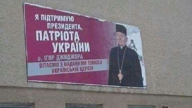 Мова йде про рекламний щит з фотографією декана Монастириського деканату УГКЦ Ігоря Джиджори, фото якого з'явилося у соцмережах ще 12 січня. На щиті цитують нібито слова о. Ігоря Джиджори «Я підтримую президента, патріота України. Вітаємо з надання томосу Українській Церкві». Рекламний щит змакетований у стилістиці, притаманній політичній рекламі БПП і президента Порошенка.