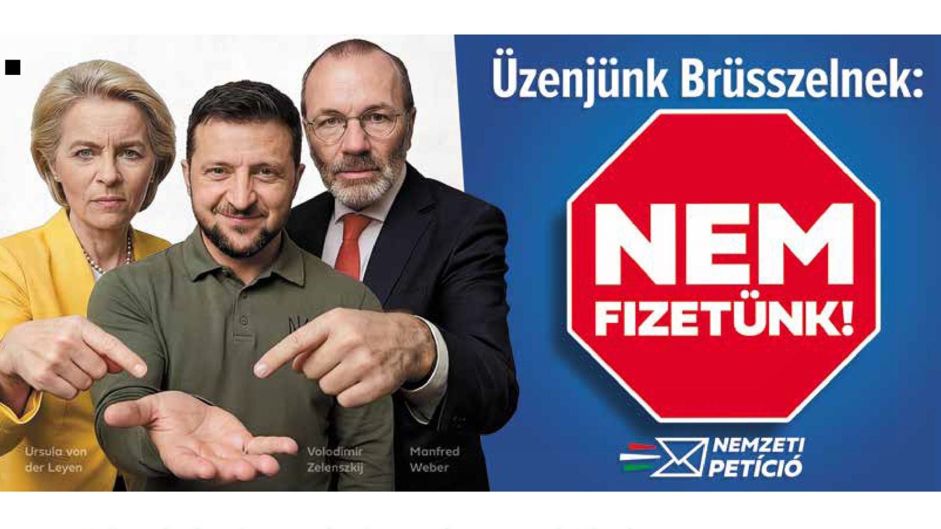 На зображенні, яке ілюструє петицію, зображений усміхнений президент України Володимир Зеленський з простягнутою рукою, а також голова Єврокомісії Урсула фон дер Ляєн і лідер Європейської народної партії Манфред Вебер, які нібито змушують дати українському президенту гроші. На червоному знаку розмістили напис «Ми не платимо».