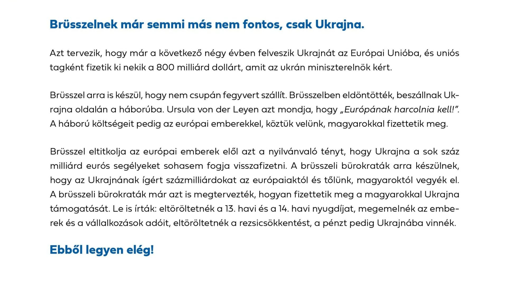 «Брюссельські бюрократи готуються забрати у європейців і у нас, угорців, сотні мільярдів, обіцяних Україні», – йдеться у тексті.