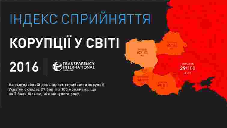 У світовому Індексі сприйняття корупції організації Transparency International Україна в цьому році посіла 131-е місце з 176 країн. Про це повідомляє прес-служба Transparency International.