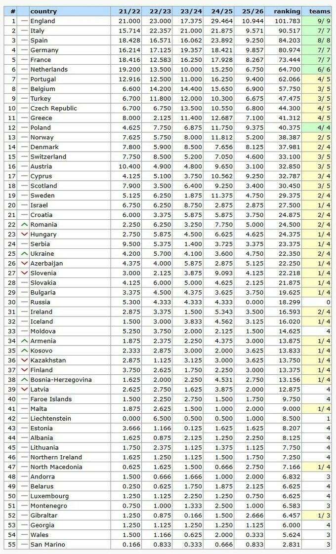 - 1. Англія – 101,783 бала (9/9 команд у єврокубках)