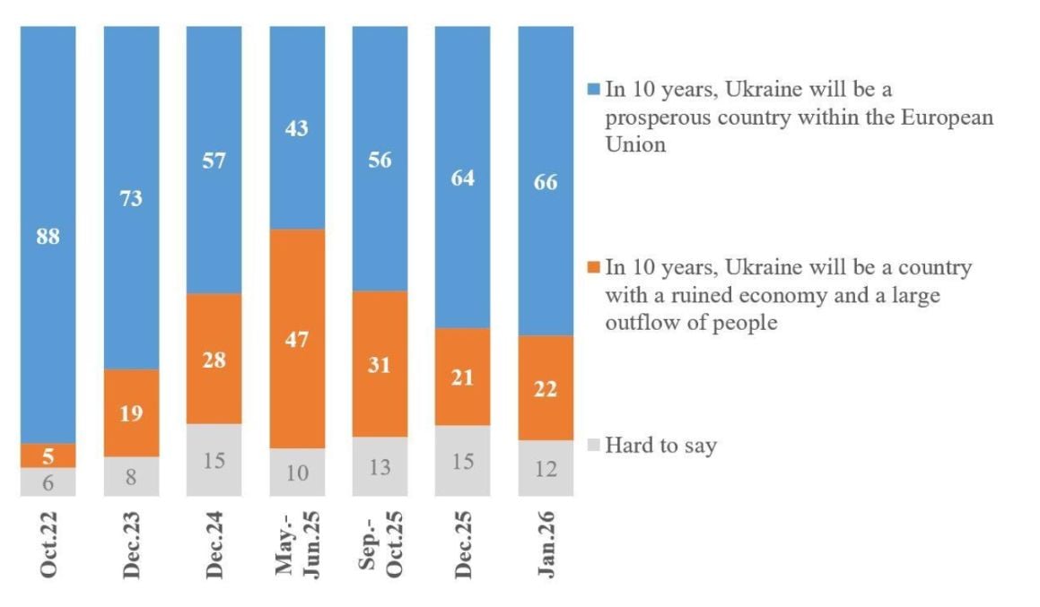 Цей результат відображає попередні висновки порівняльних досліджень щодо воєн, згідно з якими державні терористичні кампанії проти цивільного населення є для країн-агресорів невідповідним інструментом для зламу народу, що захищається. Рівень оптимізму українців щодо майбутнього країни на початку 2026 року не знизився, а, навпаки, зріс, як порівняти з 2024–2025 роками. Наскільки така позиція українців є виявом вимушеної ейфорії, а наскільки – відображенням незламної стійкості, ресурсів і потенціалу України у триваючій війні?