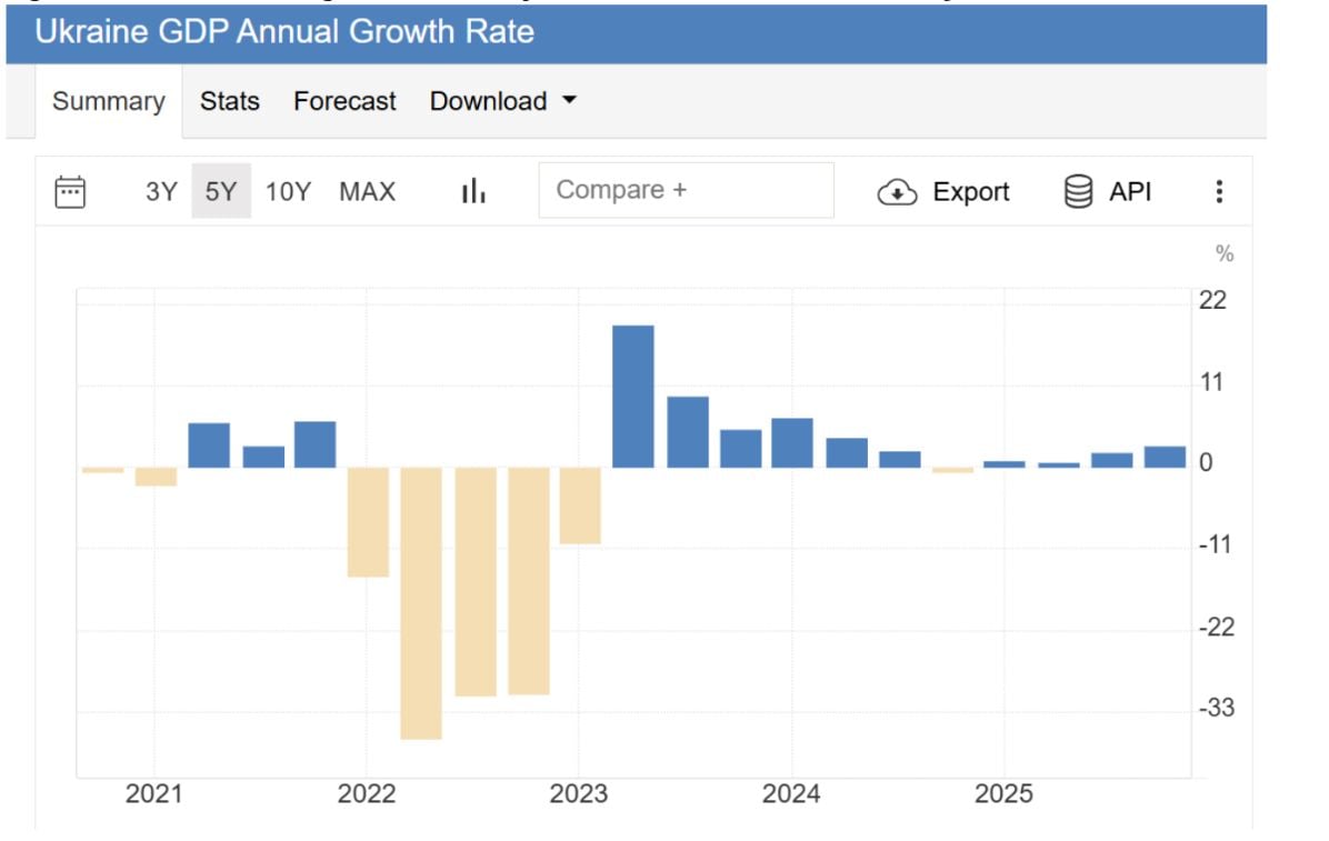 Після різкого спаду 2022 року українська економіка частково відновила свої втрати у 2023-му. Незважаючи на триваючу війну та цілеспрямоване руйнування української інфраструктури Росією, економічна ситуація повернулася до відносної рівноваги й залишається відносно стабільною. У 2025 році реальне зростання ВВП сповільнилося до приблизно 2% через постійні загрози безпеці, нищення інфраструктури й виробничих потужностей, дефіцит електроенергії й обмеження щодо робочої сили. Дефіцит торгового балансу поглибився, оскільки імпорт зріс до 84,8 млрд доларів і став приблизно вдвічі більшим за експорт. Інфляція 2025 року була напрочуд низькою і становила близько 8,0%. Середній рівень довіри підприємців і споживачів зріс порівняно з 2024 роком, що свідчить про пристосування суспільства до воєнних умов.