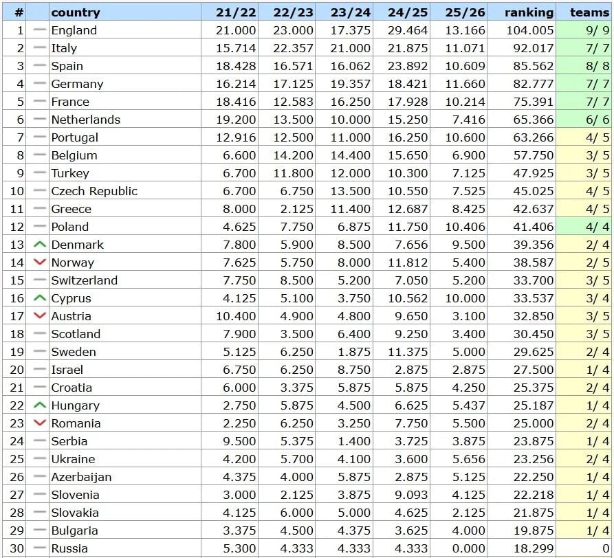- 1. Англія – 103,339 бала (9/9 команд у єврокубках)