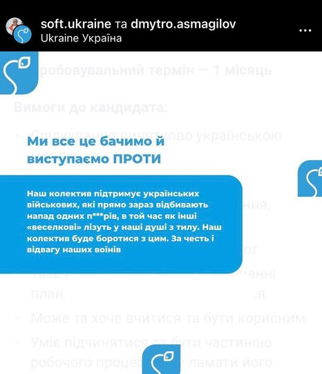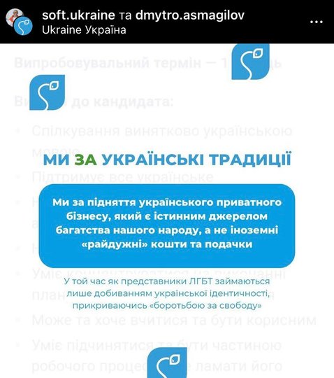 Українська IT-компанія Soft.ua потрапила у скандал через вакансію з гомофобною вимогою, в якій, серед решти пунктів для працевлаштування, була «неприналежність до ЛГБТ».