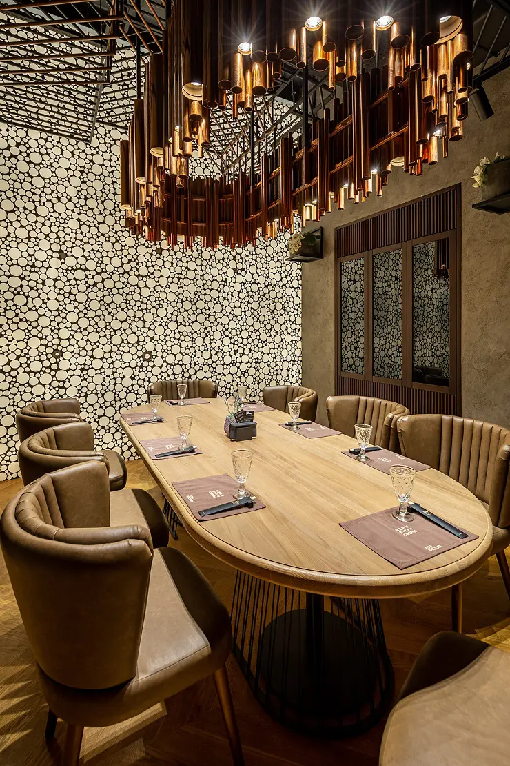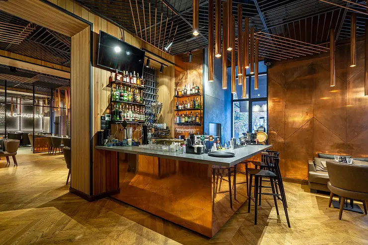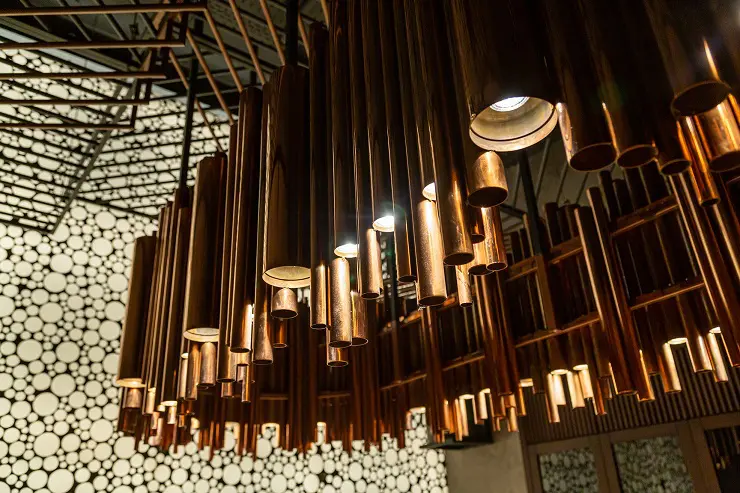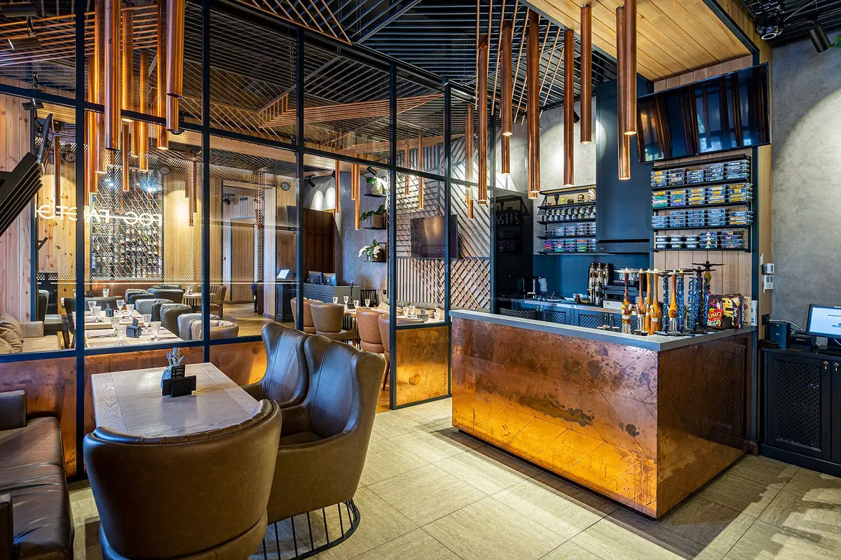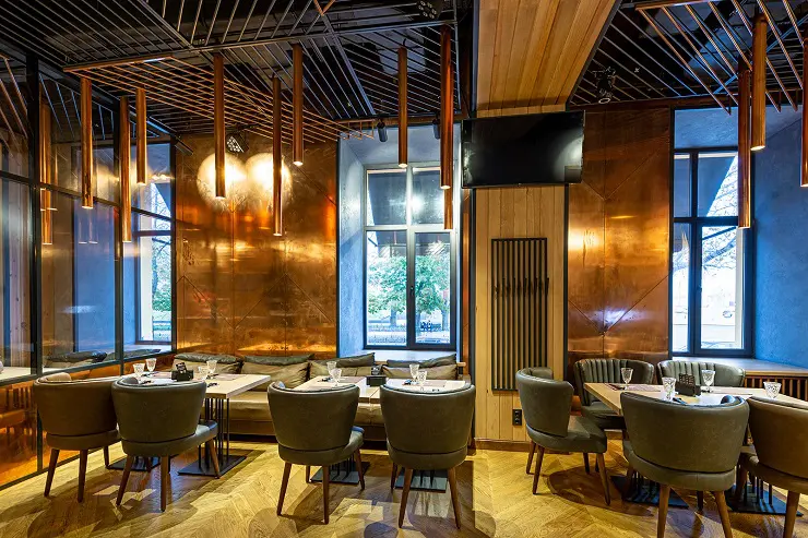 При створенні інтер’єру дизайнерів надихнули промислові металеві елементи, природні матеріали та форми. В основу було покладено поєднання холодного металу та теплого дерева з мідними листами. Акцентом інтер’єру стали мідні трубчасті лампи, які гармонійно поєднуються з мідним покриттям в решті інтер’єру.