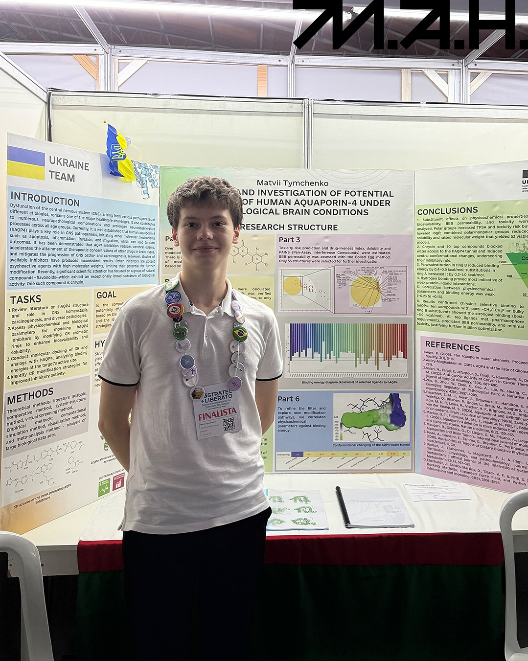 - Матвій Тимченко (Кіровоградська область) провів комп’ютерне моделювання потенційних інгібіторів аквапорину-4, що може стати важливим кроком у дослідженні патологічних процесів мозку. Учень виборов бронзову медаль. Наукова керівниця – Олена Голодаєва.