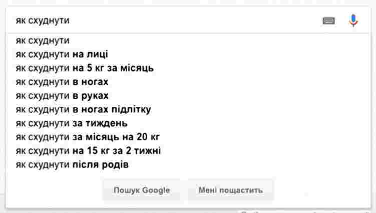 Вперше за чотири роки запит «Як схуднути» не потрапив до десятки найпопулярніших у Google. В опублікованому 11 грудня звіті компанії вказано, що найпопулярнішими питаннями, які українці вводили в пошуковик у 2018 році, стали «Чому затримують пенсію», «Як скачати відео з YouTube» та «Що таке біткойн».