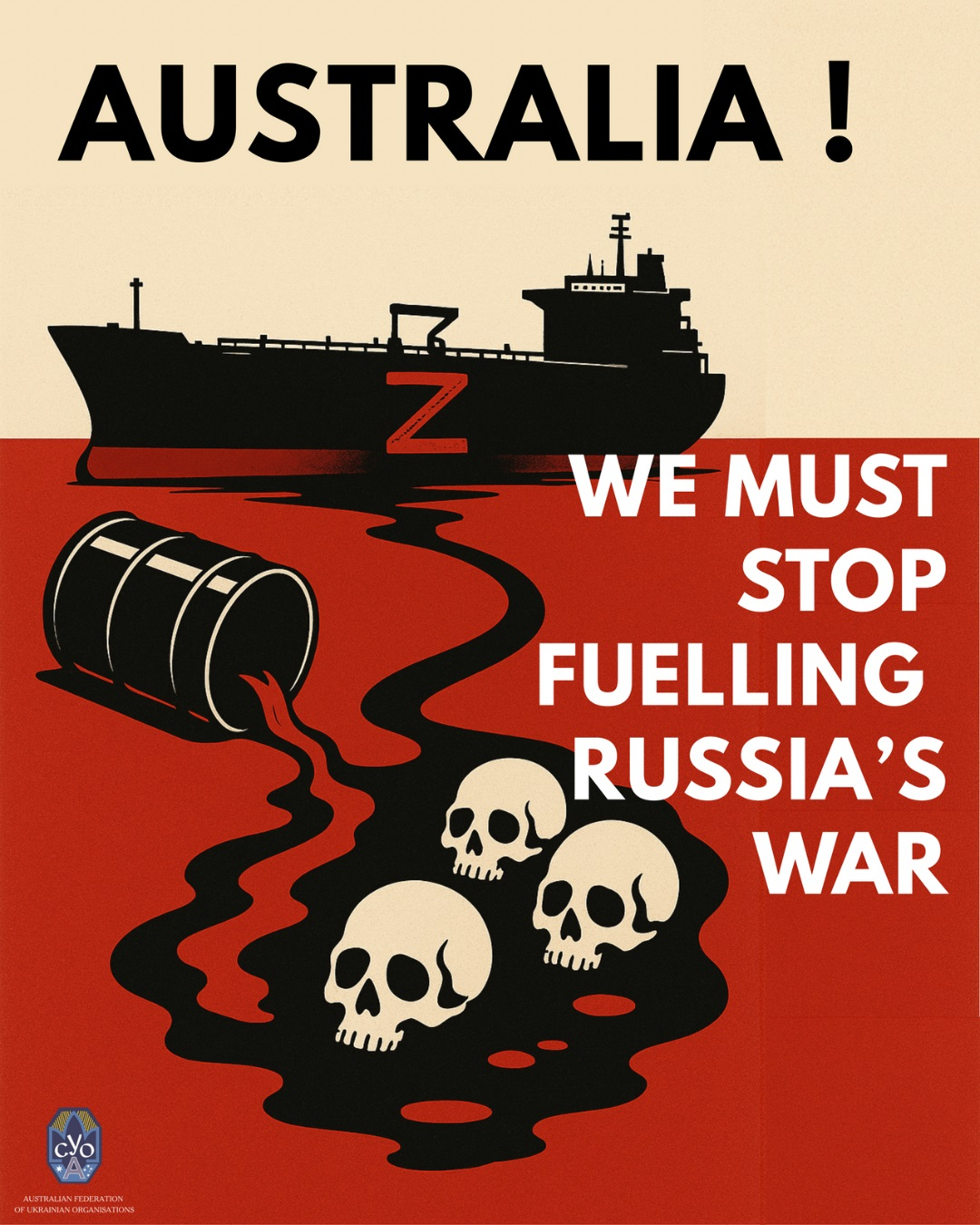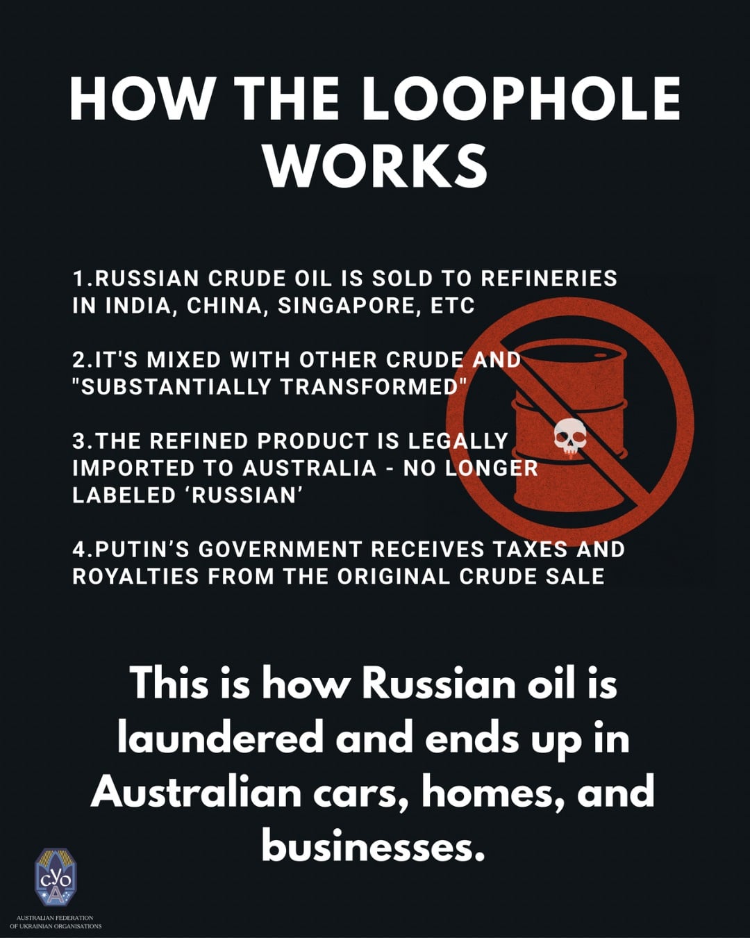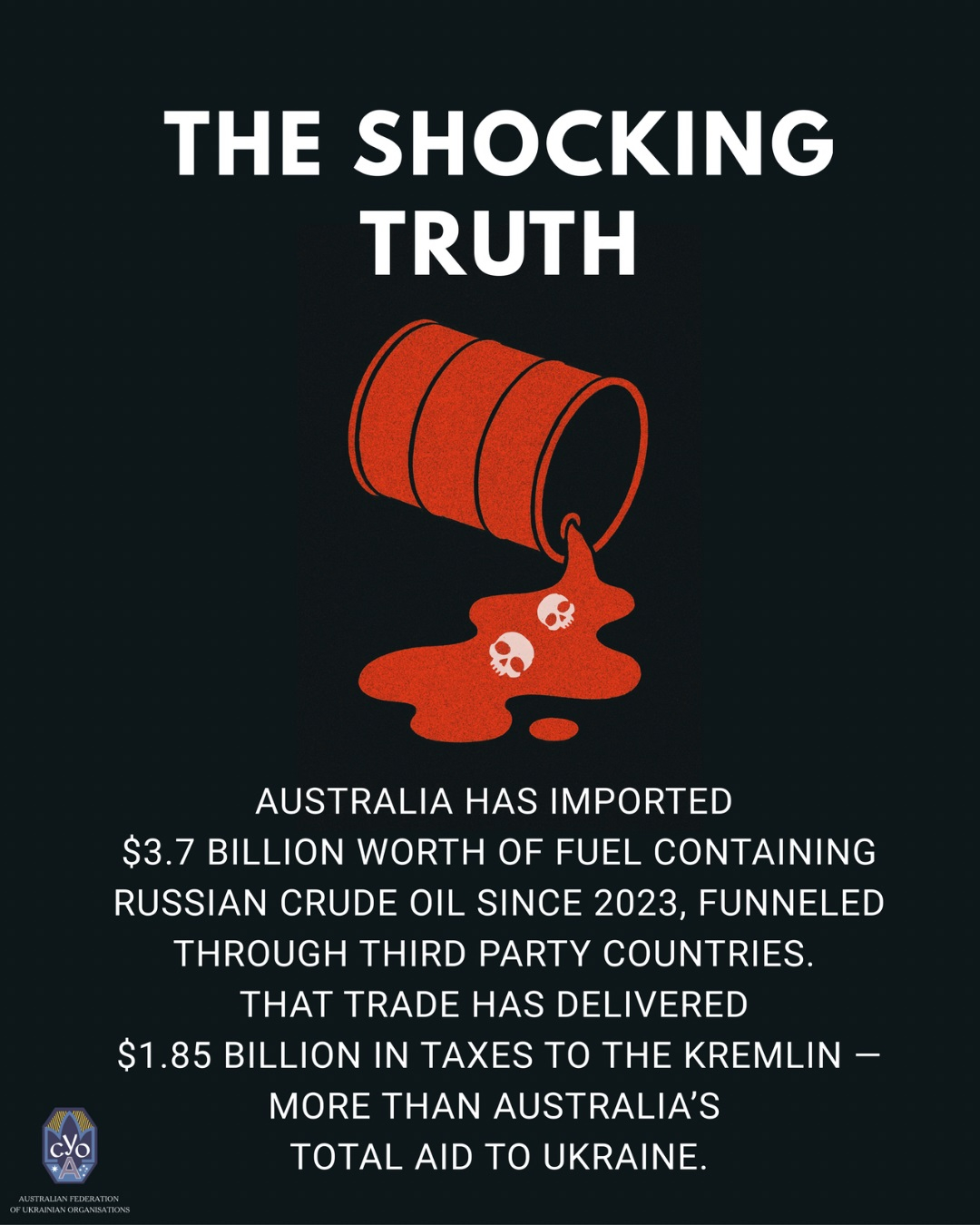 Активісти Союзу українських організацій Австралії (СУОА) вимагають від влади закрити законодавчу лазівку щодо імпорту, заборонити імпорт палива, переробленого з російської нафти, та закликати роздрібних продавців пального очистити свої мережі постачання. Організатори наголошують на тому, що кошти від купівлі російських нафтових продуктів фінансують війну проти України.