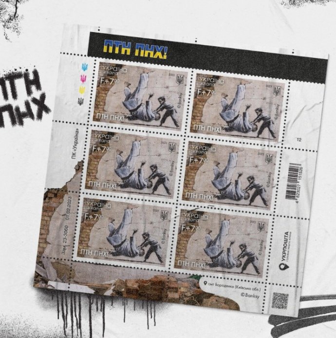 «На поштовому випуску представлено одне з семи графіті всесвітньо відомого вуличного художника та політичного активіста Бенксі, створених ним анонімно в Україні в 2022 році. Графіті з дзюдоїстом, відправленим в нокаут, художник намалював на стіні зруйнованого будинку у смт Бородянка Київської області», – йдеться у повідомленні «Укрпошти».