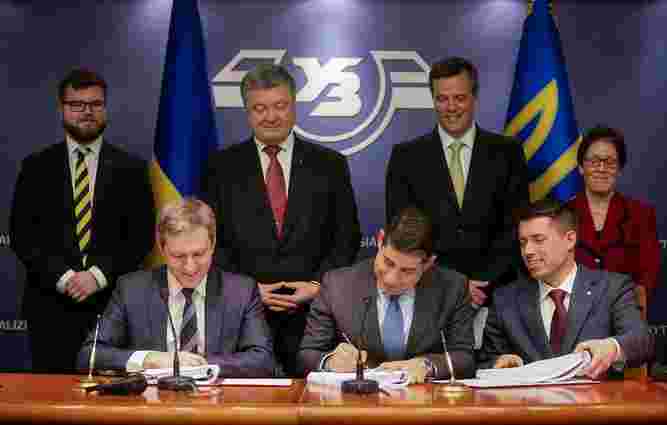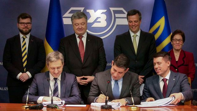 На церемонії підписання документів був присутній президент України Петро Порошенко. «Це дуже важливий день дня нас, для розвитку бізнесу та транспортної інфраструктури», - заявив він і зазначив, що недофінансування «Укрзалізниці» протягом багатьох років стало стримувальним фактором розвитку української економіки.