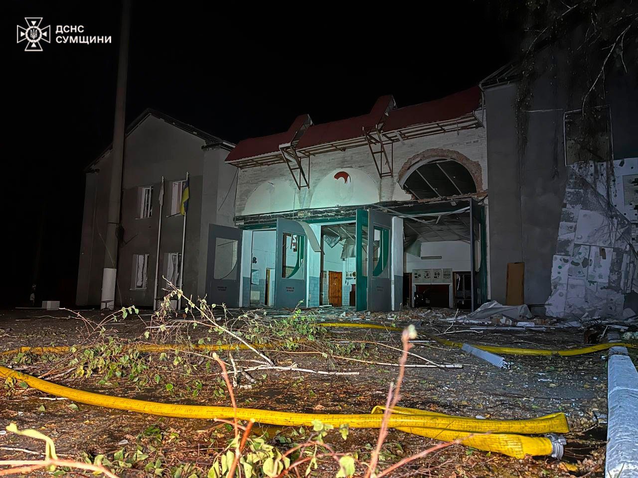 Згодом у ДСНС України повідомили, що ворог завдав удару по пожежно-рятувальному підрозділу Шостки. На фото з наслідками атаки по підрозділу видно часткові руйнування будівель.