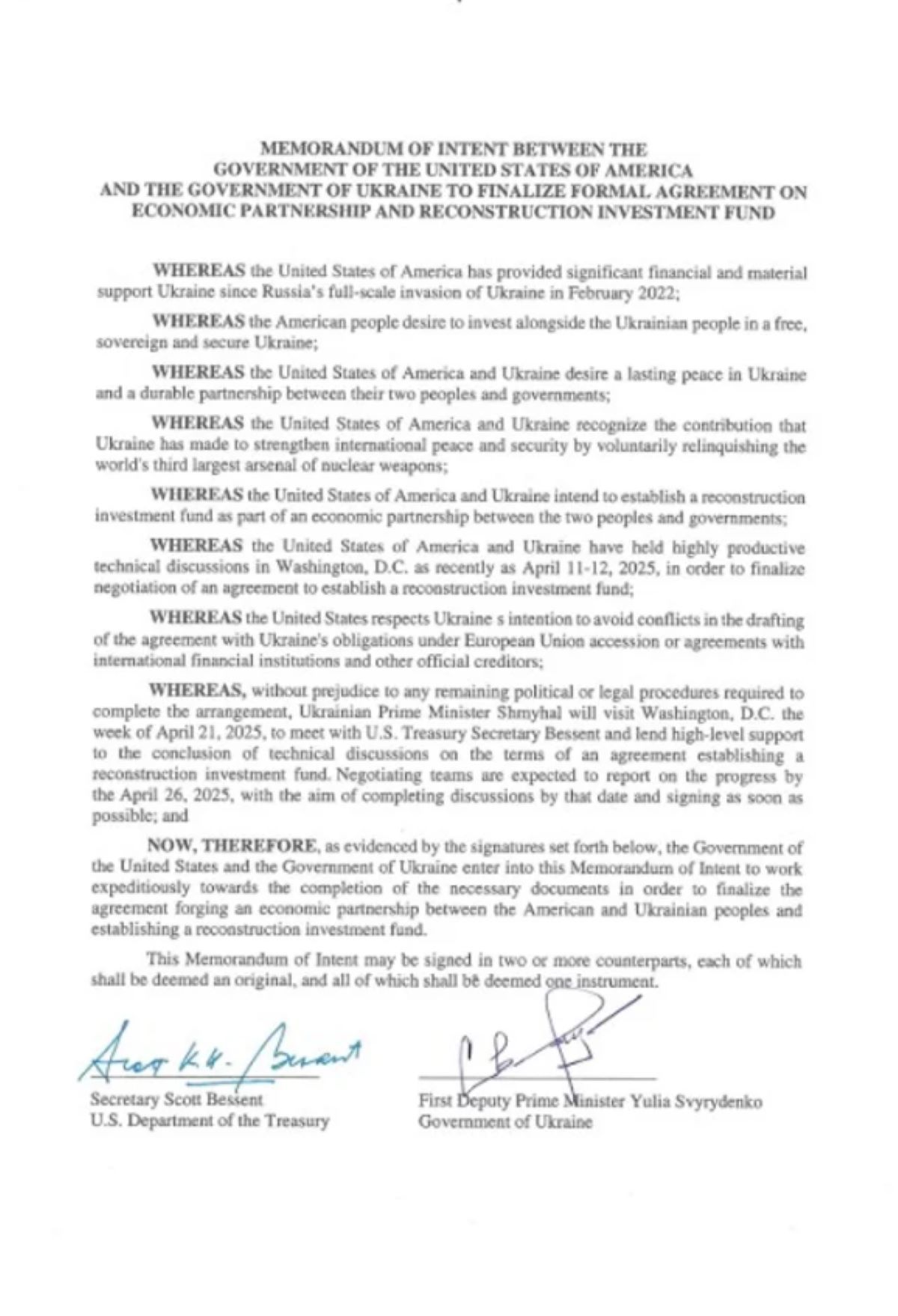На сайті Кабміну 18 квітня опублікували текст документа «Меморандум про наміри між урядом Сполучених Штатів Америки та урядом України щодо завершення укладення формальної угоди про економічне партнерство та фонд інвестицій у відбудову».