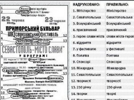 На Приморському бульварі в Севастополі відбувся фестиваль до 230-річчя заснування міста. В україномовній афіші, що інформувала про захід, було стільки помилок, що її фото розмістили в інтернеті. Більшість помилок хтось повиправляв ручкою, а наприкінці вивів оцінку – "2". Серед організаторів фестивалю – Міністерство освіти і науки та Товариство "Просвіта" ім. Тараса Шевченка.