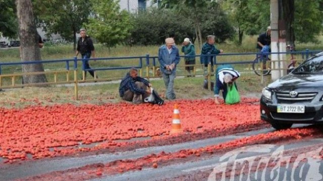 Як повідомляє Телеканал новин “24” з посиланням на місцеве видання «Гривна», херсонці не розгубились, і почали жадібно збирати помідори, які вціліли після аварії. Люди наповнювали ними пакети і навіть відра.