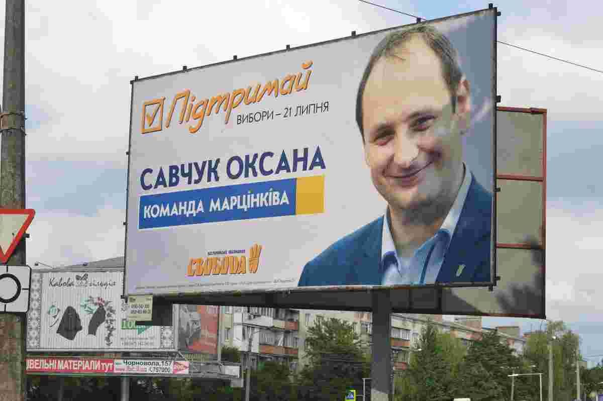 На 83-му окрузі в Івано-Франківську впевнено лідирує секретарка міської ради Оксана Савчук, яка до виборів використовувала незвичну агітацію, опублікувавши на білбордах фото мера Руслана Марцінківа замість свого.