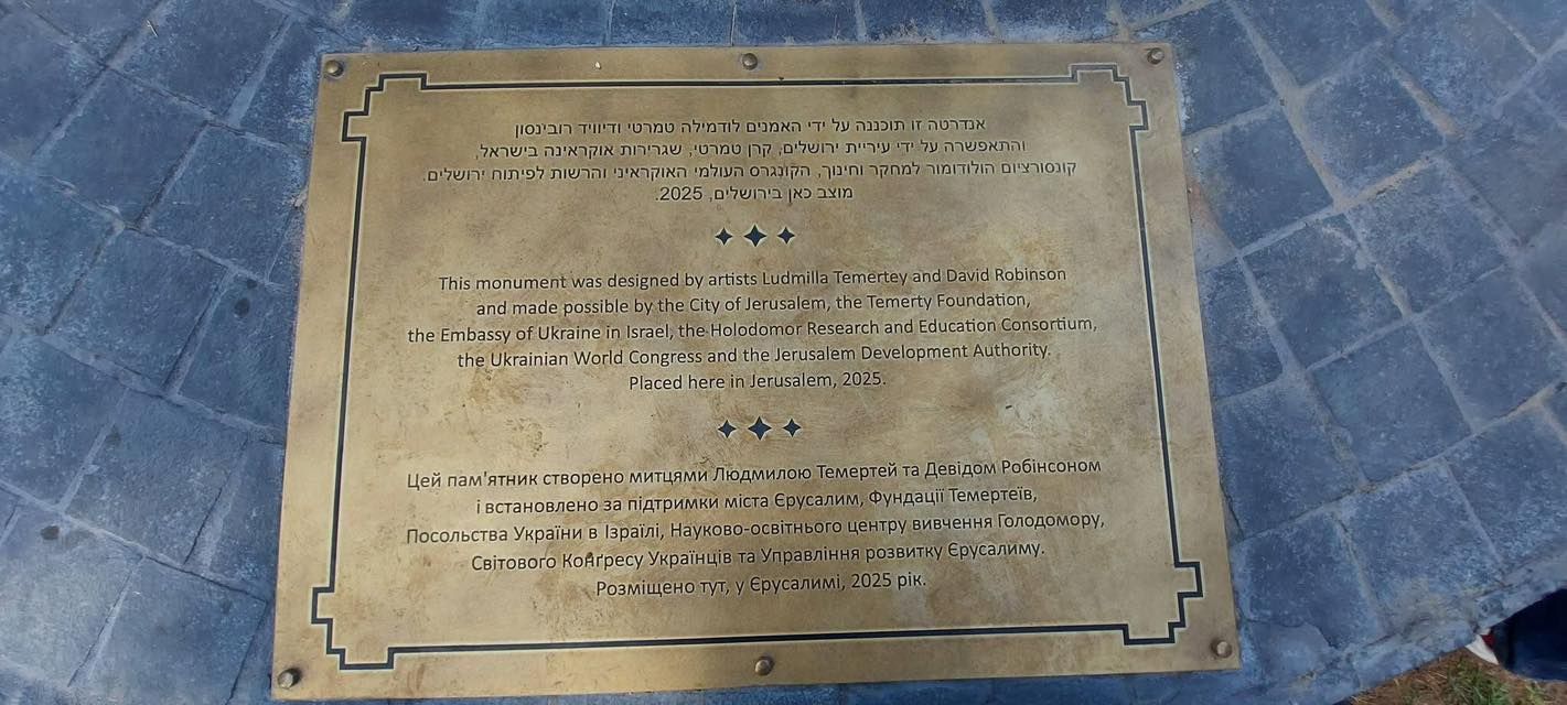 У Єрусалимі, на території Саду Троянд, встановили перший в Ізраїлі пам'ятник жертвам Голодомору 1932-1933 років. Авторами скульптури стали Девід Робінсон та канадська мисткиня українського походження Людмила Темертей. Зазначимо, що Ізраїль поки офіційно не визнає Голодомор геноцидом Українського народу.