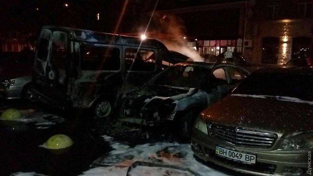 Останнє загоряння сталося на вулиці Рекордній в 5:30. На місці пожежі знайшли залишки пластикової пляшки, дроту і батарей на капоті однією з згорілих машин. Всього внаслідок пожежі постраждали п'ять машин.