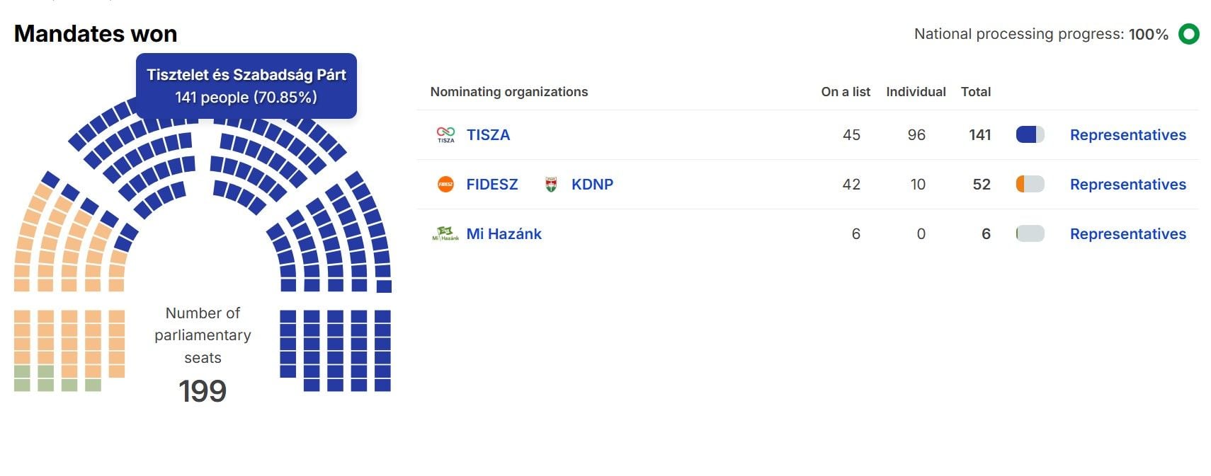 Увечері 18 квітня Національна виборча комісія Угорщини (NVI) оприлюднила остаточні результати парламентських виборів, згідно з якими опозиційна партія «Тиса» здобула конституційну більшість у парламенті Угорщини нового скликання.