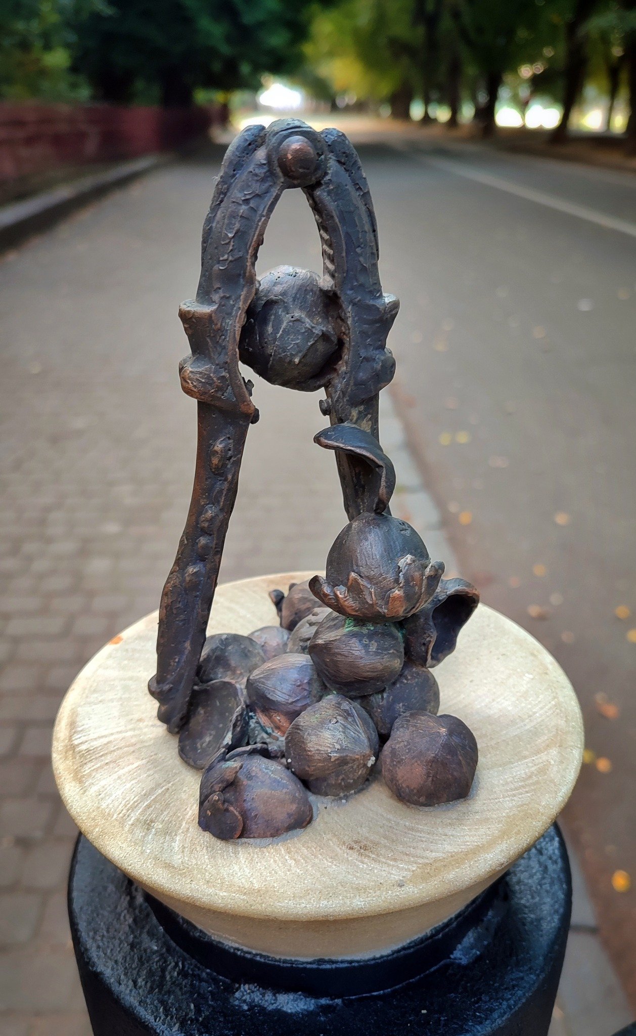 «Скульптурка являє собою вертикально розташований горіхокол с затиснутим в ньому фундуком. Ще з десяток горіхів під ним. Встановлена міні-скульптура за кошти меценатів з відомої плантації фундука на Закарпатті», – зазначив Олександр Богданов.