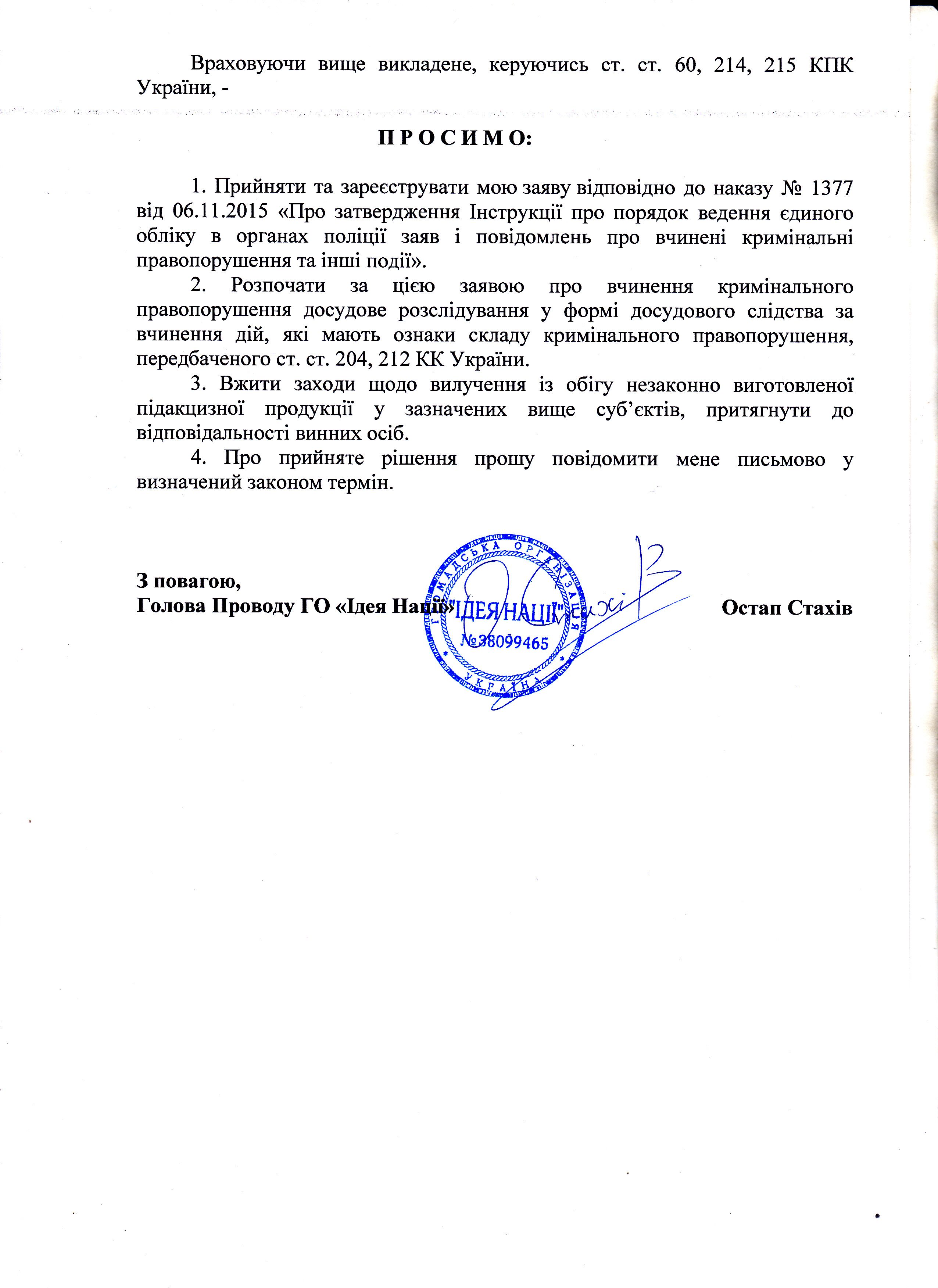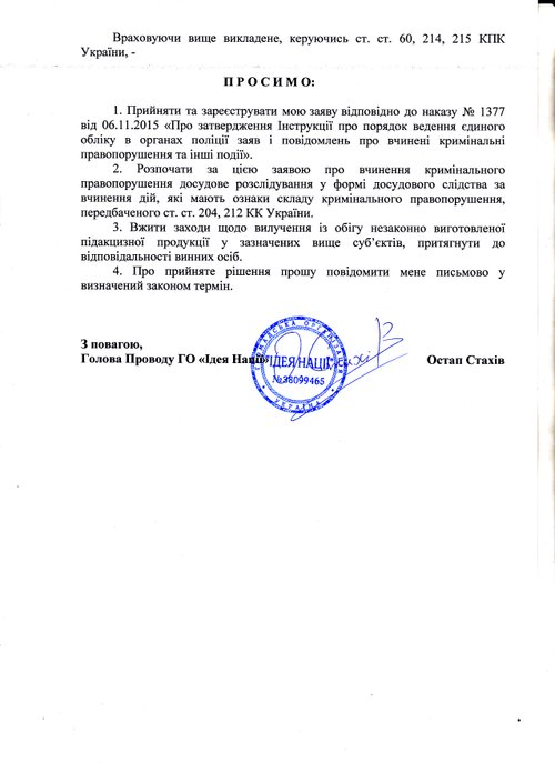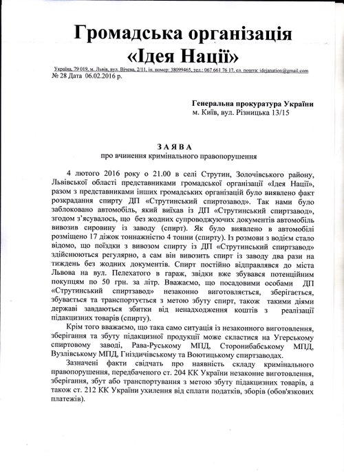 Про серйозність намірів активістів свідчить той факт, що через день після виявлення факту нелегальних операцій з підакцизними товарами, вони звернулися до Генеральної Прокуратури України з заявою про скоєння кримінального злочину. У цій заяві є не тільки детально описаний епізод, що мав місце 4 лютого на ДП «Струтинський спиртзавод», але і вказано на можливість нелегального виготовлення, зберігання та збуту підакцизної продукції на Рава-Руському, Сторонибабському, Узловському, Гніздичівському і Воютицькому спиртзаводах. Збиток від розкрадань активісти оцінюють у кілька сотень мільйонів гривень на місяць за цінами чорного ринку.