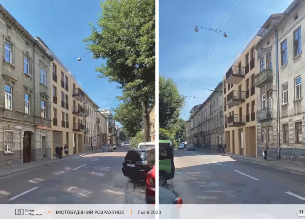 «Четвертий поверх – це до карнизу, що співмірно трьом історичним поруч – зліва і справа, ще один поверх заглиблений, мансардний додатковий поверхи. І в кінці ділянки є флігель за історичним розплануванням. Між ними – спортивний дитячий майданчик», – розповів під час засідання виконавчого комітету головний архітектор Львова Антон Коломєйцев.