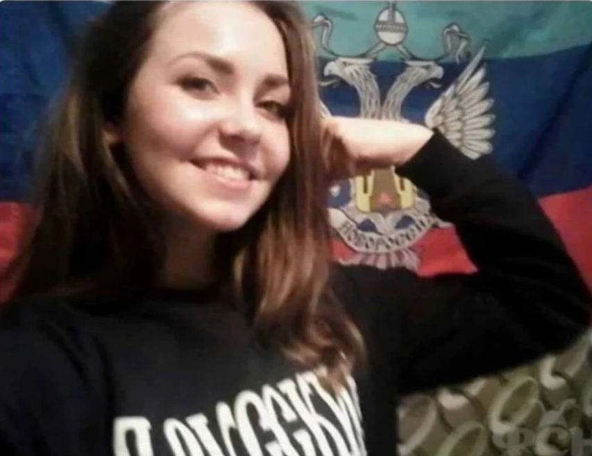 Фото Єви Коршик на фоні прапора так званої ЛНР та у футболці «Я русский»