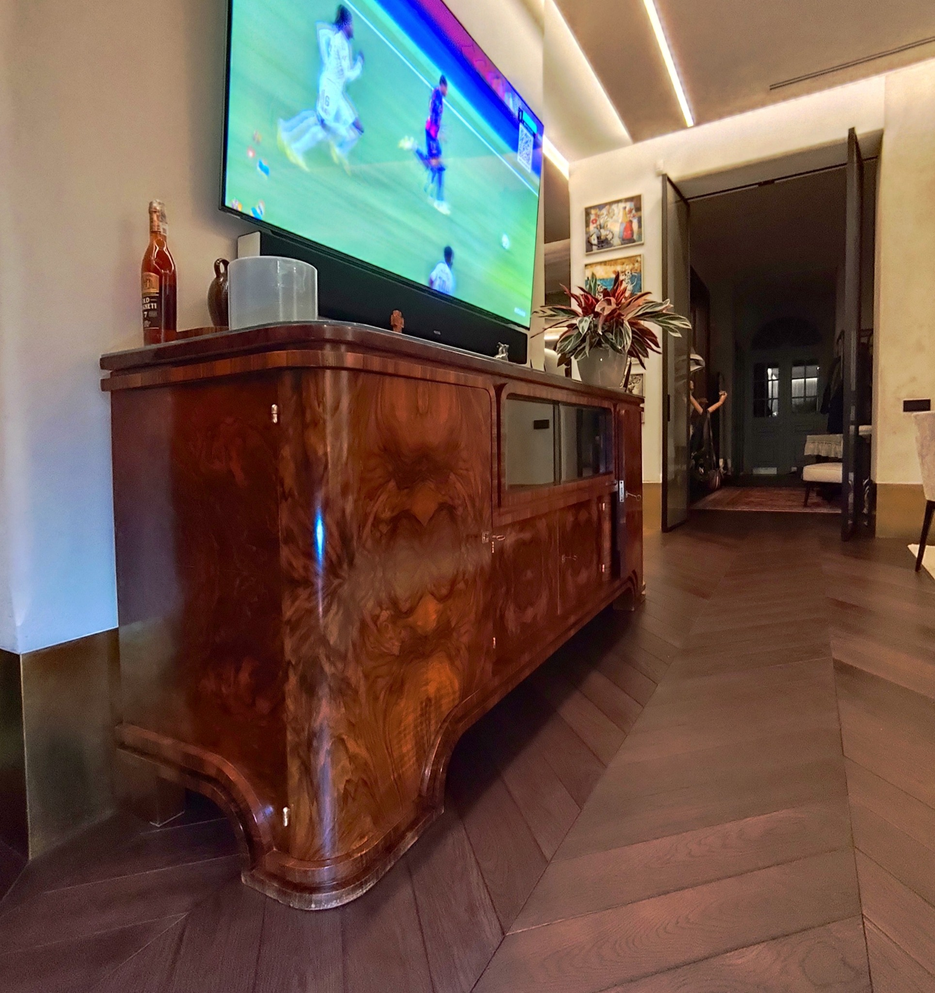 Господиня розповіла, що будинок звели 1906 року, але в 1920 його перебудували в стилі ар деко. Від первісного вигляду залишилися лише архівні креслення, на яких можна помилуватися деревʼяною верандою в народному стилі. Період ар деко відтворюють поодинокі розписи стін і стелі, які дивом вціліли після пожежі. Їх відновили реставратори Karp Resorer.