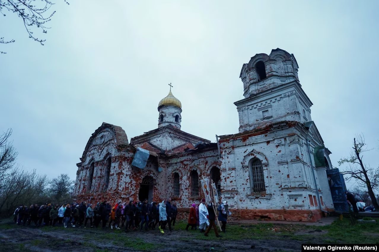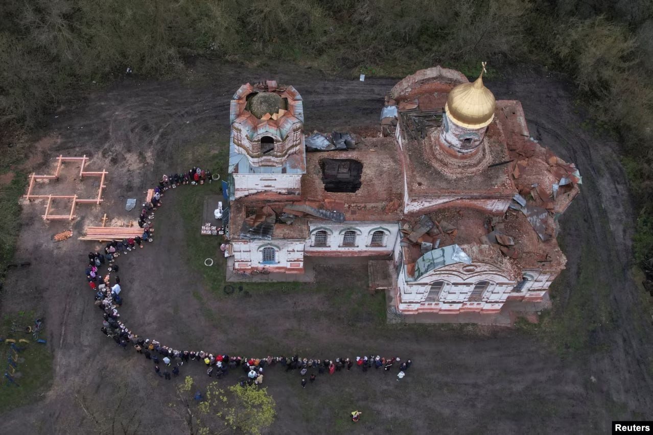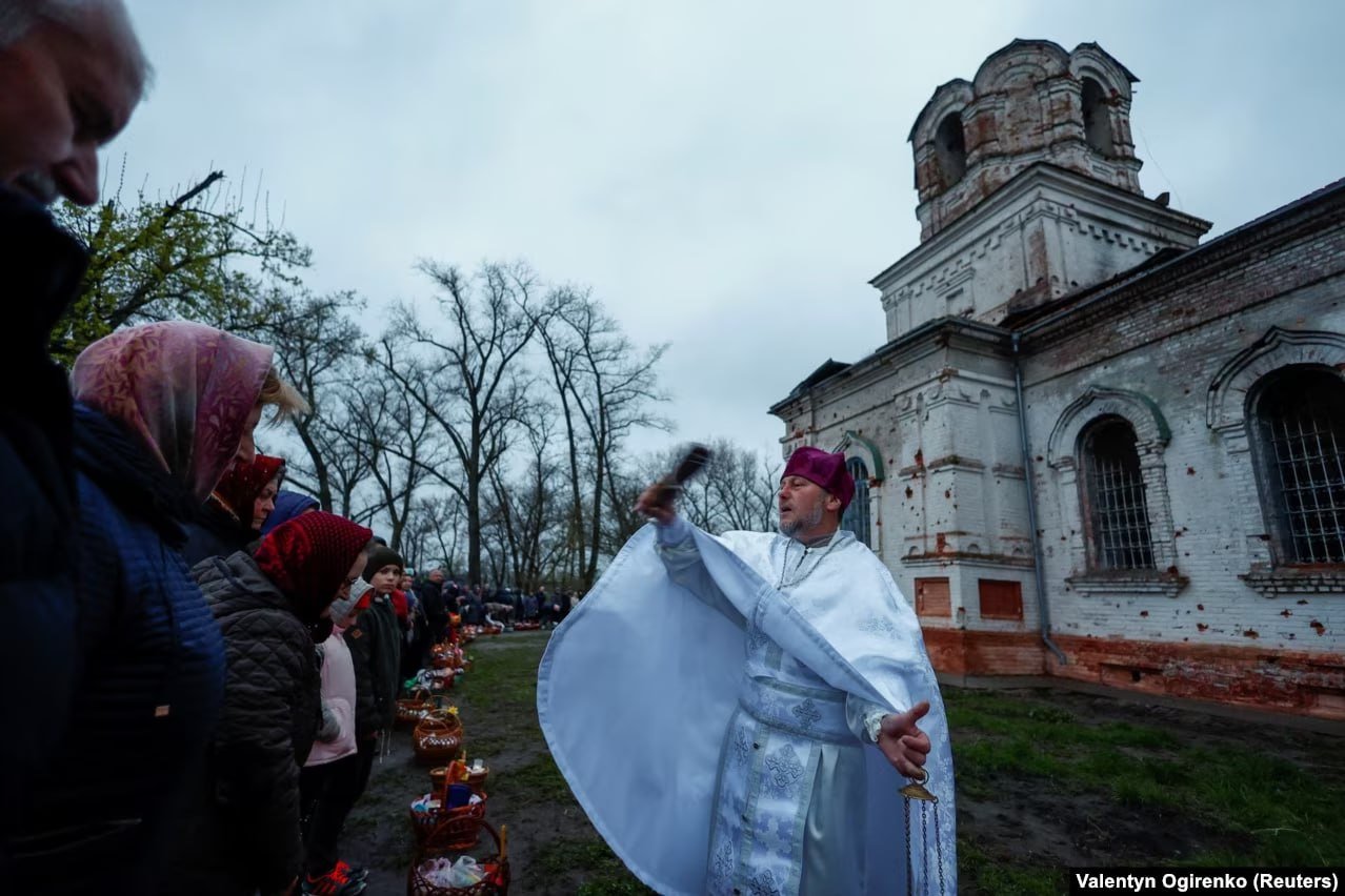 Кілька десятків мешканців села Лукашівка у неділю, 16 квітня, прийшли на великодній молебень до зруйнованої росіянами церкви Вознесіння Господнього ПЦУ. На фото Reuters видно, як священик освячує кошики вірних поблизу церкви. Сакральній споруді бракує купола, її стіни мають сотні слідів від влучань снарядів, частина даху обвалилась, а всередині храм повністю вигорів. Однак попри це люди все одно прийшли до церкви на Великдень. Під час наступу на весні 2022 року російські військові влаштували у церкві свій штаб, там же вони їли, жили, облаштували катівню та зберігали боєприпаси. Село Лукашівка було в російській окупації 21 день. Церква Вознесіння Господнього є пам’яткою архітектури початку ХХ століття.