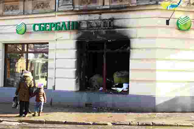 В ніч на 22 лютого у Львові невідомі підпалили два відділення російських банків. Відділення «Сбербанку Росії» поблизу Стрийського ринку вигоріло вщент. Там же постраждала і приватна квартира на другому поверсі. У відділенні «ВТБ Банку» поблизу податкової згоріли меблі на першому поверсі. Спроба підпалу ще одного відділення «Сбербанку» навпроти готелю «Львів» виявилася невдалою.