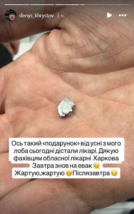 Постраждалого госпіталізували до обласної лікарні Харкова, де йому надали необхідну медичну допомогу. Згодом Христов оприлюднив фото уламка, який лікарі дістали з його голови.