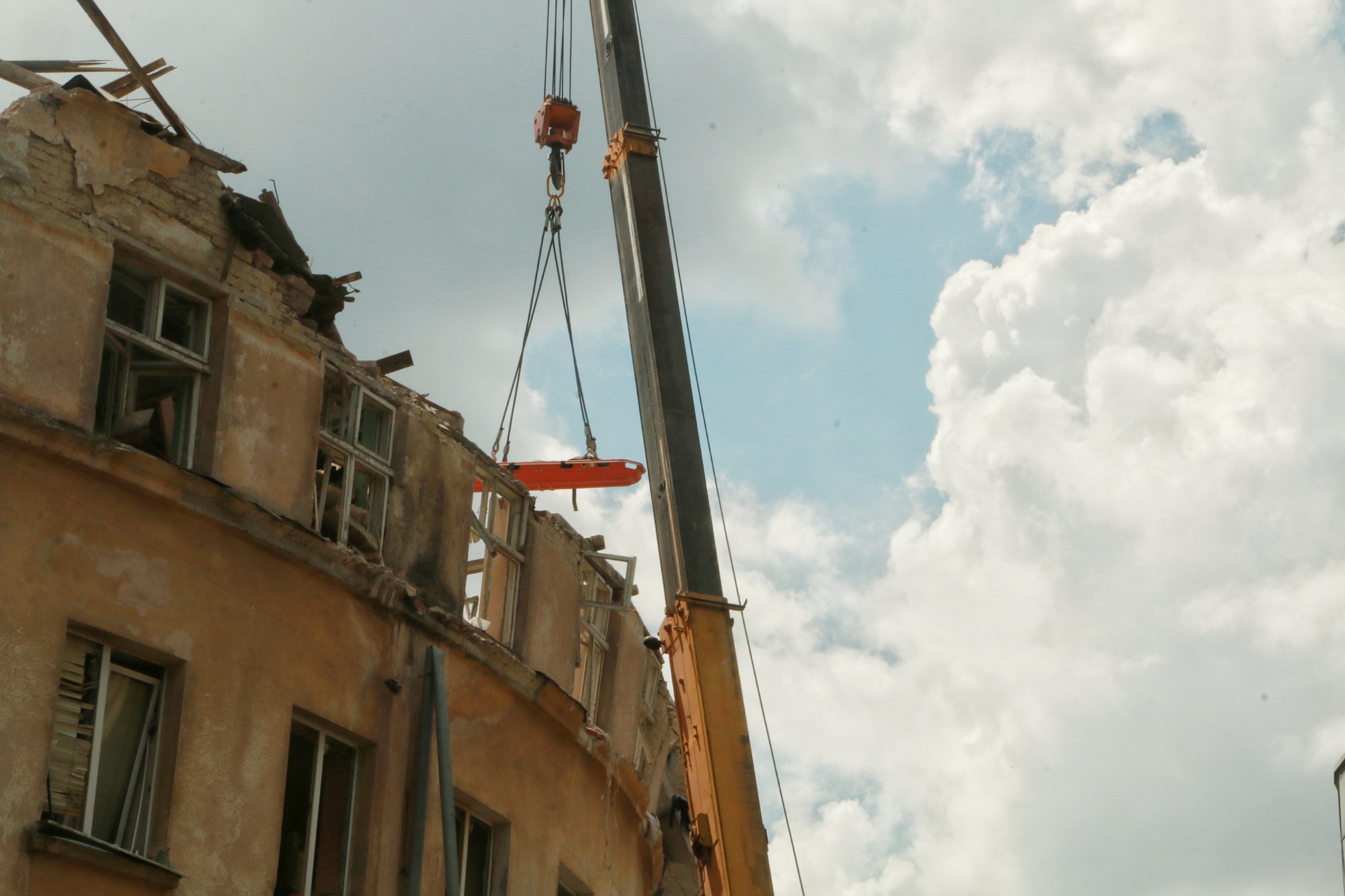 На вході до круглого внутрішнього дворика будинку, у який влучила ракета, комунальники просять натовп розступитися, щоб чергова машина змогла вивезти сміття. Частина подвір'я перегороджена стрічками, за якими працюють рятувальники. Вони руками перебирають руїни, скидають з будинку цеглину за цеглиною, меблі та все, під чим все ще перебувають кілька мешканців будинку.