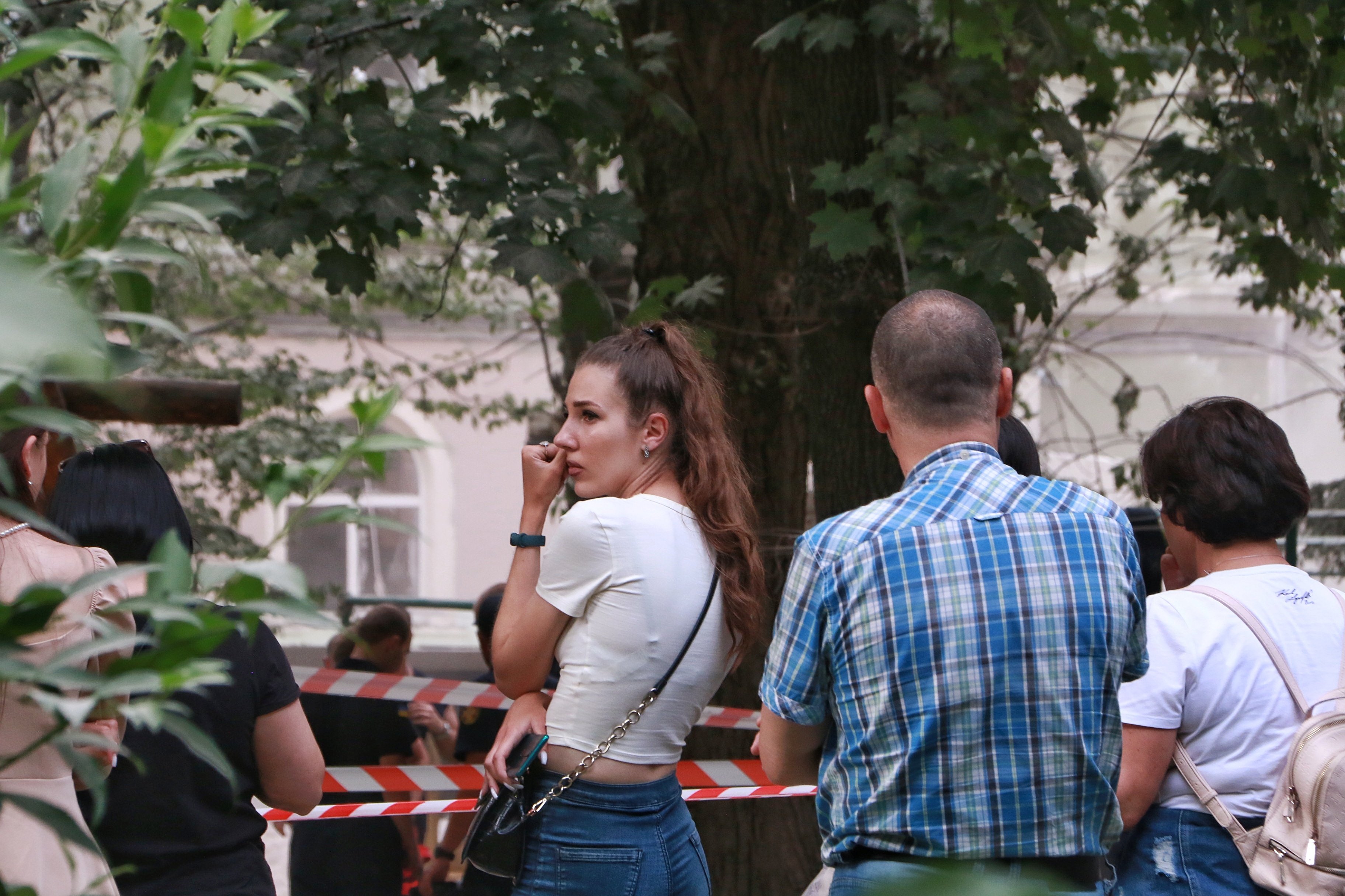 Позаду Ірини жінка розмовляє телефоном: «Я звідси не піду, поки її не побачу». Це Ольга, яка також шукає свою подругу та колегу.