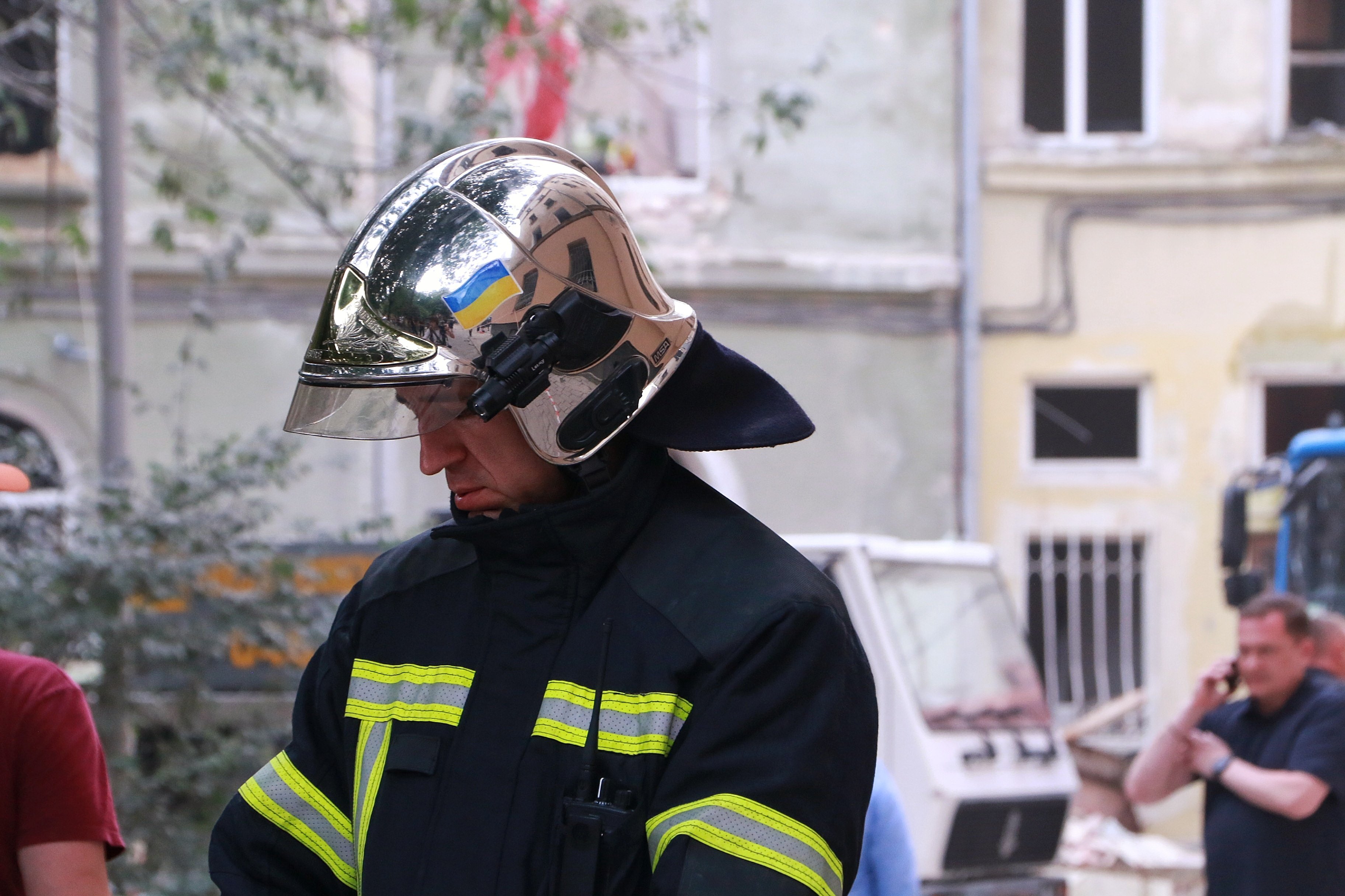 Людей у подвір'ї меншає. Рятувальники беруть коротку перерву на обід. Вони лежать на траві, витирають з костюмів пил. За всім спостерігають перехожі. Діти катаються на самокатах. Поліцейські перекривають вхід у подвір'я й пропускають лише мешканців. Над будинком гудуть дрони. Автомобілі досі вивозять скло. Комунальники допомагають людям закривати вибиті вікна плівкою і фанерними плитами.