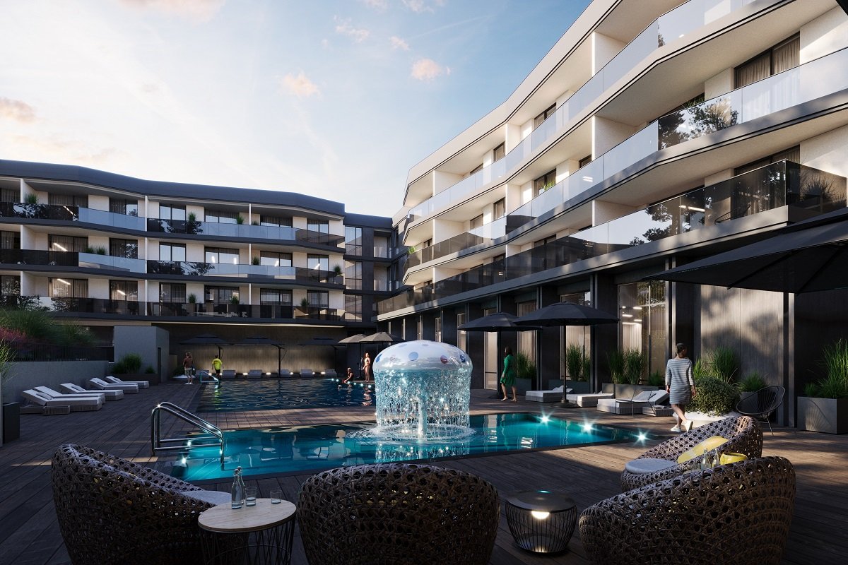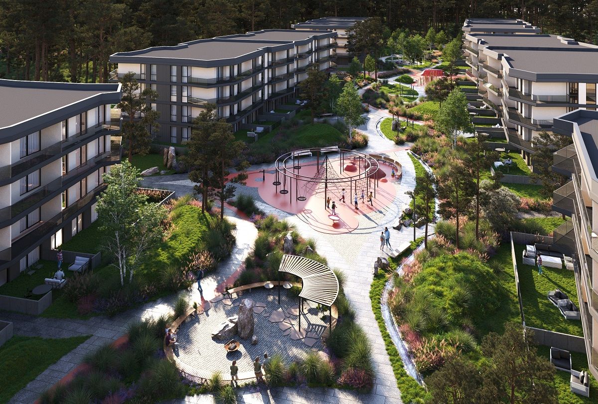 Комплекс також пропонує закриту територію, що гарантує безпечний простір усередині, завдяки власній охороні та системі відеоспостереження. При цьому на закритій території облаштують воркспейс із накриттям із сонячних панелей, зону з басейнами для дорослих та дітей, та облагороджений простір безпосередньо у лісі.