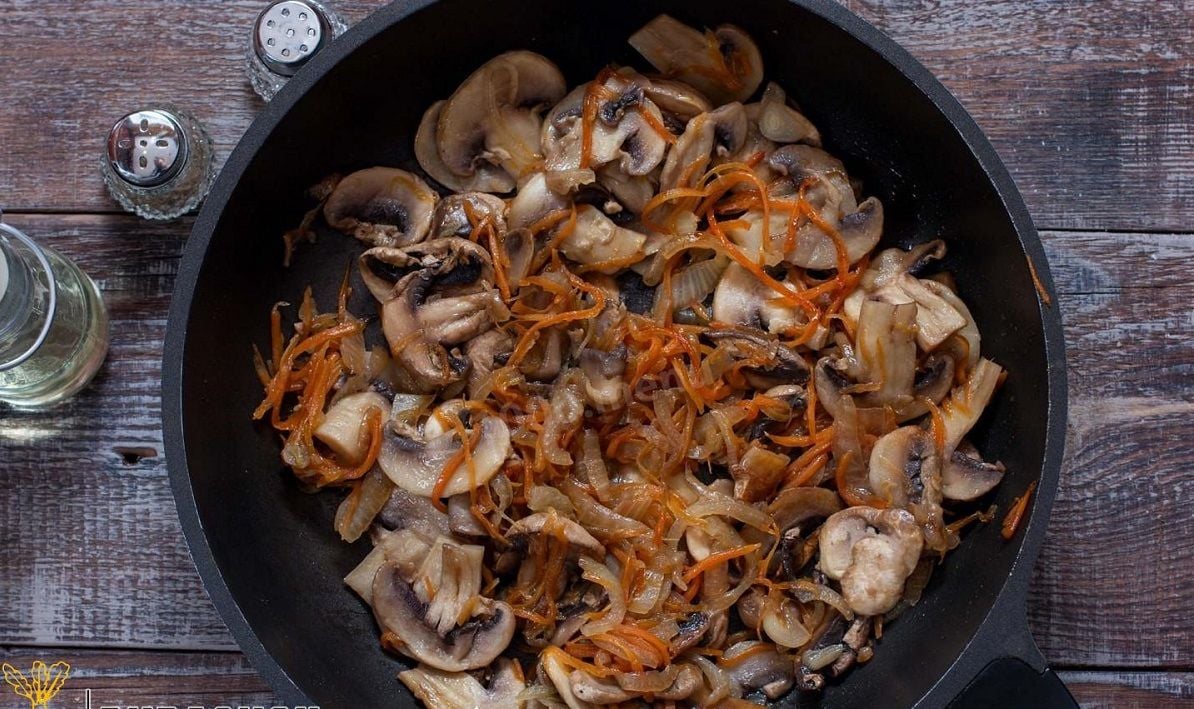Гриби обсмажити до випаровування рідини, додати олію, цибулю та моркву соломкою, наприкінці додати часник, соєвий соус, лимонний сік (або бальзамік), мед і перець, перемішати й подати теплим.