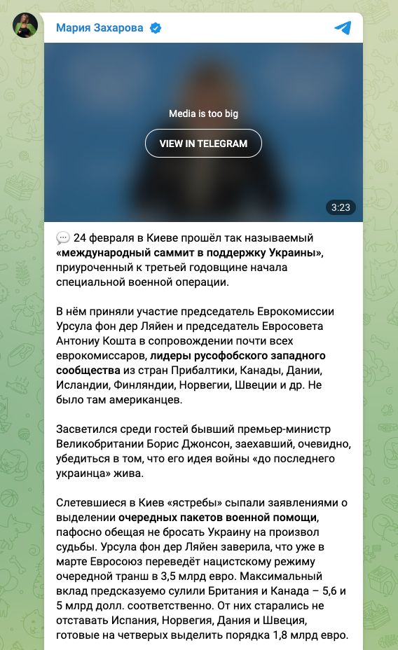 Тут і використала тезу «війна до останнього українця», якою у своїх дезінформаційних кампаніях користується Кремль, і згадала про так званий «прєступний» київський режим, і намагалася нівелювати допомогу від країн ЄС образливими висловлюваннями. Навіть заявила, що представники європейських країн належать до «партії війни».