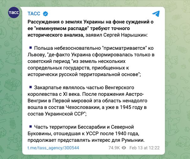 Тим часом директор Служби зовнішньої розвідки Російської Федерації Сєргєй Наришкін вирішив поділитися псевдоісторичними міркуваннями про «розпад України».