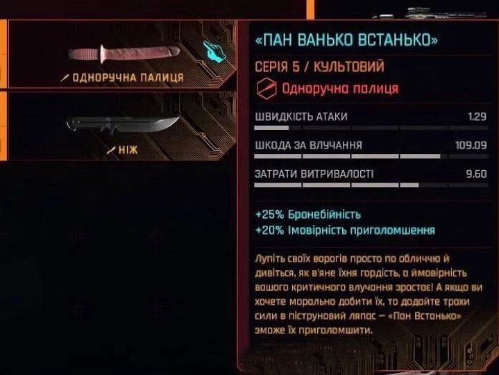 У новому перекладі щодо членів російської банди у Найт-Сіті звучить слово «русня», а поза навпочіпки у фоторедакторі гри тепер називається «як росіянин». Також змін у назві зазнала культова зброя гри, бойова секс-іграшка, яка отримала назву «Пан Ванько Встанько». Змін зазнали і назви завдань в основній грі. Зокрема, гравці можуть пройти квест «Голос країни».