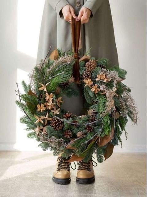 7. Використовуйте свіжі хвойні гілки як традиційну та ароматну основу різдвяних віночків. Прикріпіть їх до дротяного каркаса або просто зв’яжіть разом, щоб утворити круглу форму.