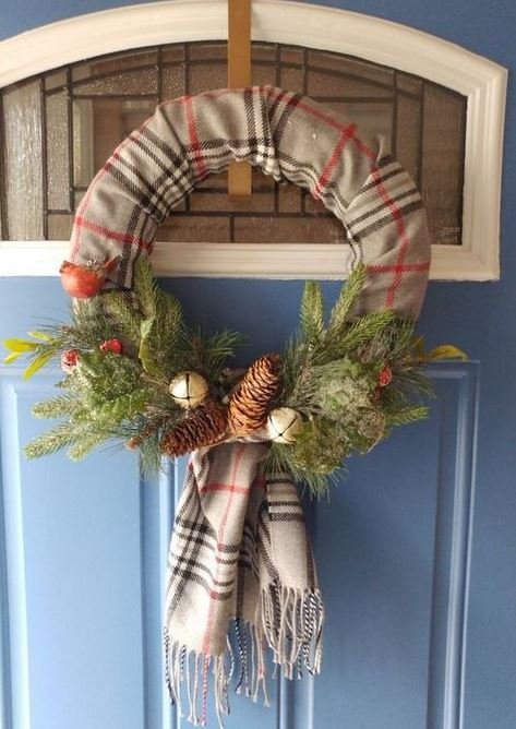 Обмотайте об’ємну основу старим в’язаним шарфом, додайте новорічні прикраси у вигляді сніжинок – і отримайте х’юге-віночок.