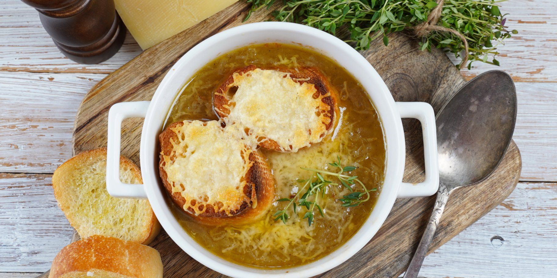 Цибулю нарізати тонкими півкільцями. На оливковій олії з маслом повільно карамелізувати її 20-25 хвилин до золотистого кольору. Тоді влити вино, дати випаритися на половину, додати бульйон і лавровий лист. Варити 10 хвилин, посолити й поперчити. Багет підсушити в духовці, посипати сиром, запекти 2-3 хв. до рум’яної скоринки. Суп розлити в глибокі тарілки, зверху покласти сирний тост.