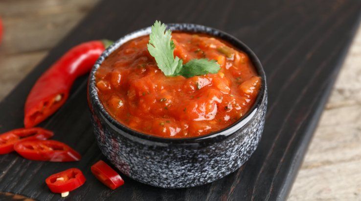 Цибулю нарізати дуже дрібно, помідори очистити від шкірки й нарізати кубиками. Додати чилі та дрібно нарізану кінзу. Заправити соком лайма, посолити, перемішати. Подавати до тако, буріто або як соус до риби.