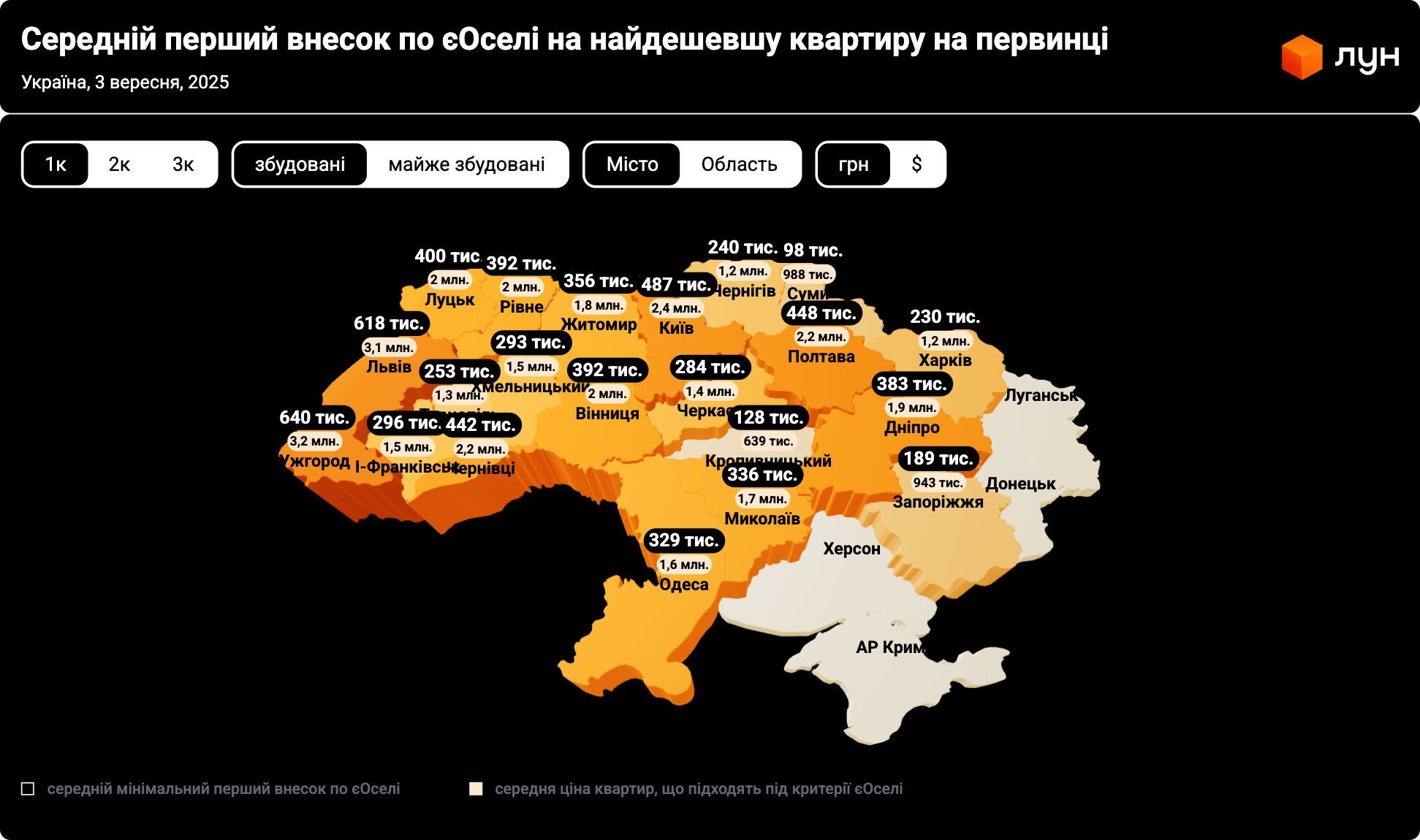 Для порівняння, в Києві мінімальний перший внесок за житло за програмою «єОселя» становить від 487 тис. грн. А найдоступніша іпотека в містах центральної та східної України: у Харкові – 230 тис. грн, в Сумах – 240 тис. грн, в Запоріжжі – 189 тис. грн. А найнижчий поріг входу в країні показав Кропивницький – лише 128 тис. грн.
