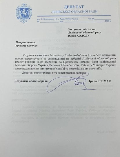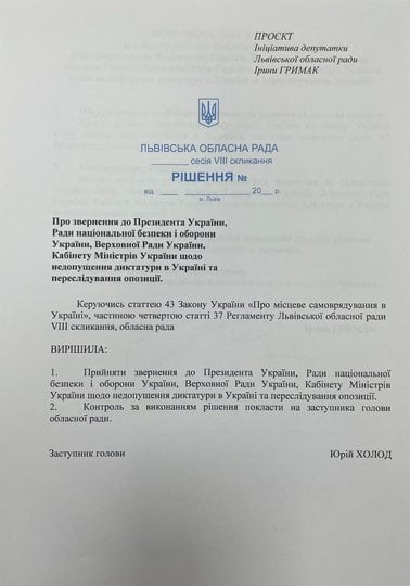 12 лютого РНБО запровадила санкції проти пʼятого президента України, народного депутата та бізнесмена Петра Порошенка, а вже 14 лютого керівник осередку «Європейської солідарності» на Львівщині, нардеп Олег Синютка та депутатка Львівської облради, ексголова ради Ірина Гримак повідомили про ініціативу скликання позачергової сесії Львівської облради для ухвалення звернення про недопущення диктатури в Україні.